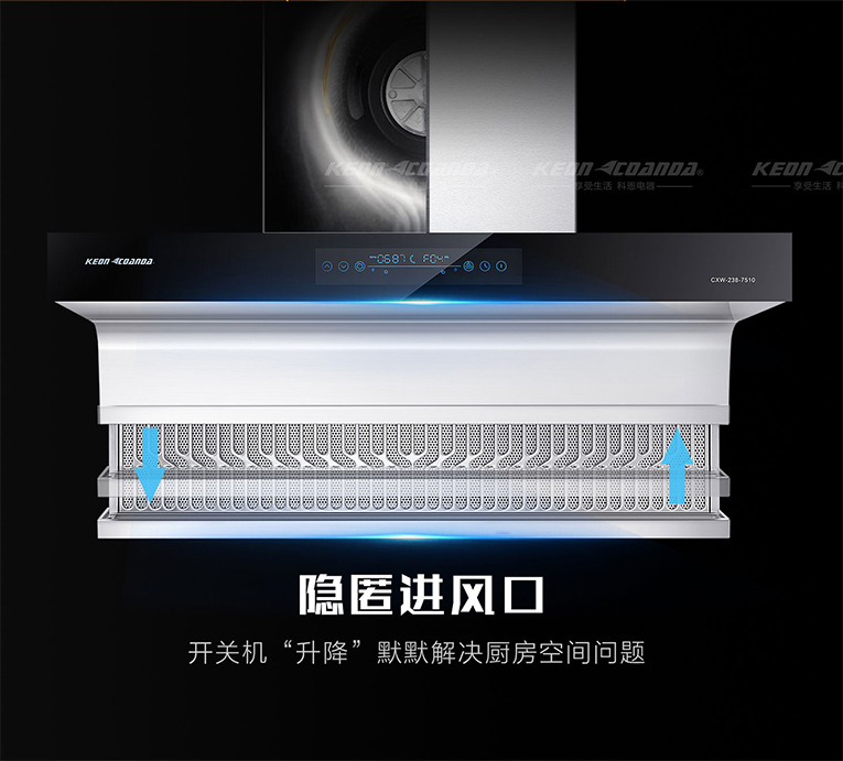 油煙機除了大吸力,從源頭把油煙控制住,不給任何逃逸的機會才是關鍵!想要實現(xiàn)無煙廚房,煙機的吸排是關鍵,集成灶十大品牌、廚電行業(yè)十大品牌科恩變頻大吸力智能體感操控煙機從吸排進行突破,低位凈細直排系統(tǒng),速吸速排,強勁吸力帶來高效吸凈效果!為了達到精準的控煙效果,科恩變頻大吸力智能體感操控煙機采用立體風場18.5m3/min大吸力,有效聚攏凈吸,打造油煙防護墻!另外7510擁有現(xiàn)代化自動升降科技感,開關機“升降”默默解決老廚房空間問題!