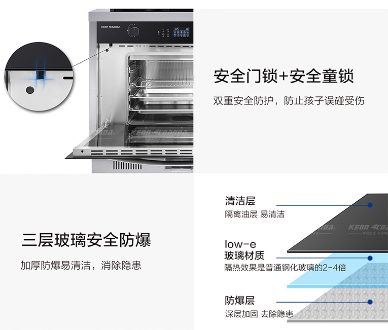 同時集成灶十大品牌、廚電行業(yè)十大品牌科恩蒸烤消一體集成灶蒸菜時也不會出現冷凝水滴落的現象,配備了蒸汽后排技術,蒸汽隨著風機自動排出,菜與菜之間不會串味,這樣出來的菜品也就色香味俱全!另外箱門還有多層高溫防護技術,在普遍的耐高溫鋼化玻璃基礎上,中間再置入一層Low-e玻璃材質,隔熱效果是普通鋼化玻璃的2-4倍,避免不小心燙傷皮膚。