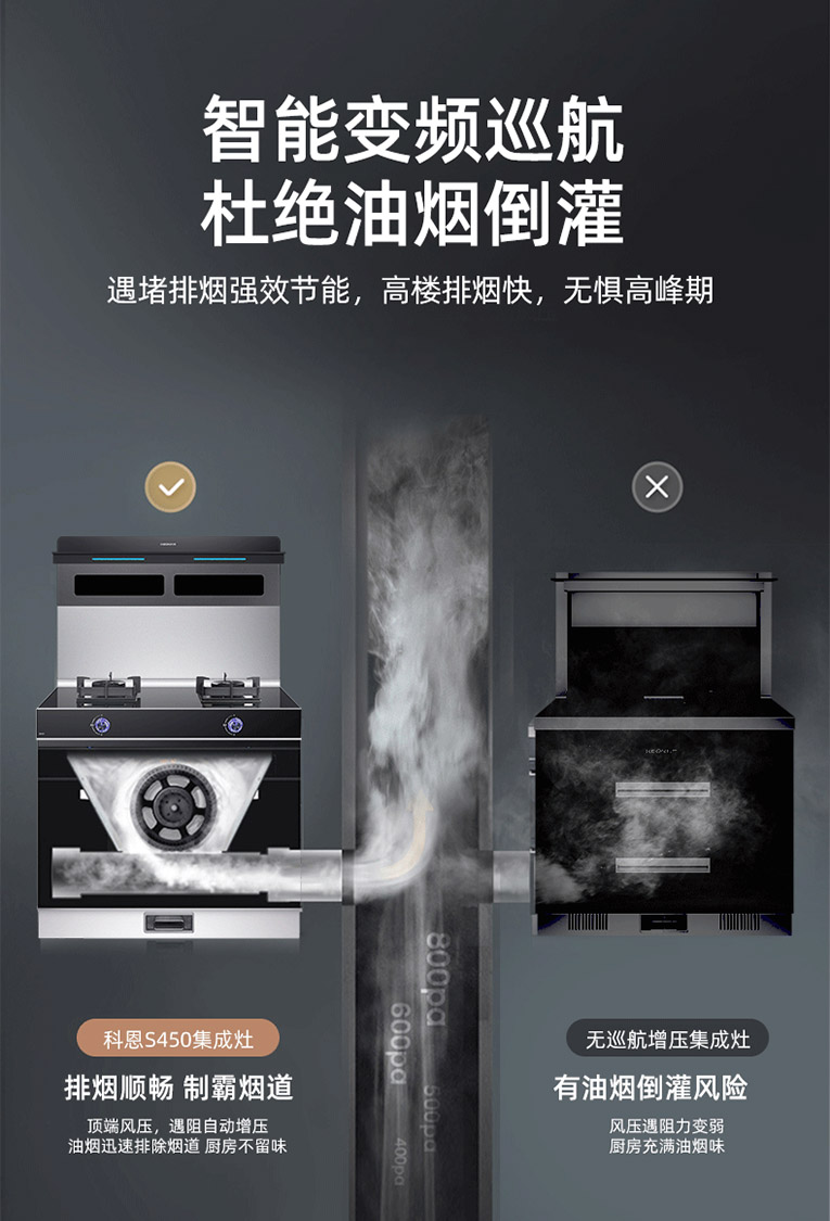 S450智能語音左右蒸烤集成灶采用20m3/min大吸力,720Pa大風(fēng)壓,低空封鎖油煙升騰區(qū),吸凈雙灶爆炒煙,搭載智能變頻巡航,遇堵排煙強效節(jié)能,高效排煙快,杜絕油煙倒灌。