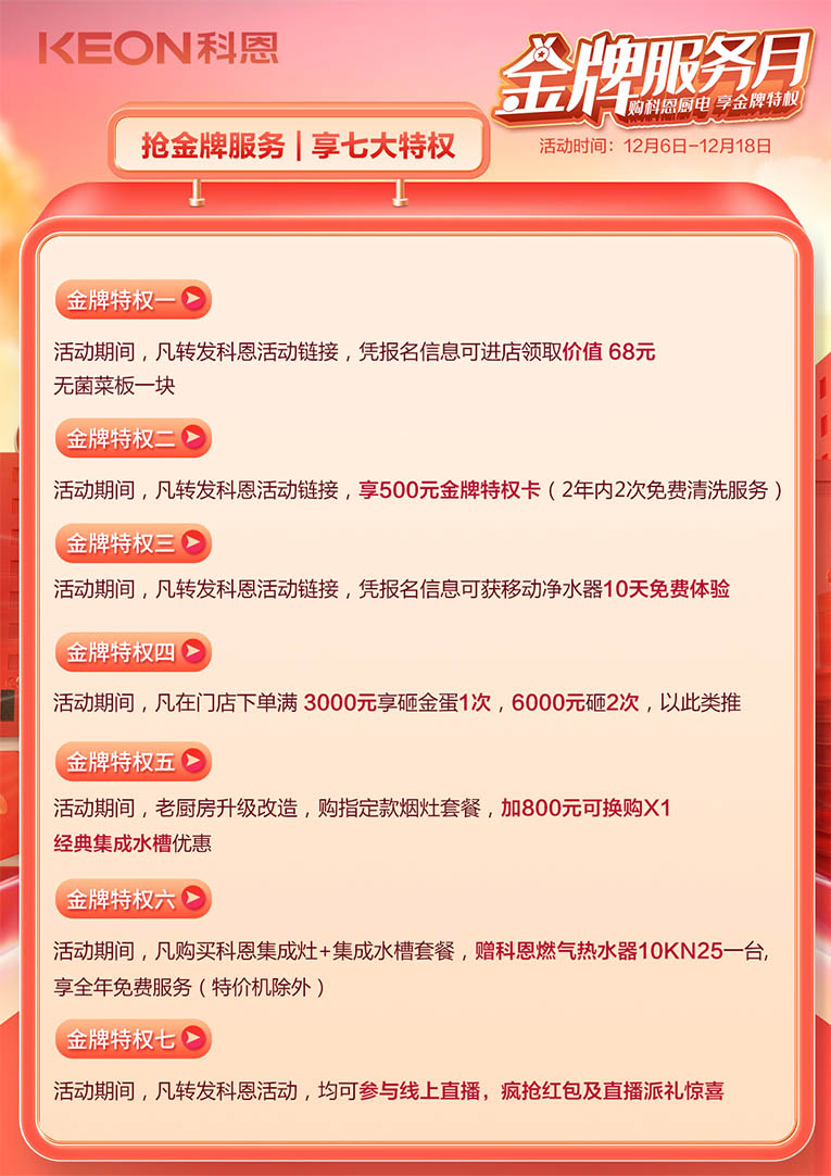 踐行科恩12余年來(lái)一直給予消費(fèi)者的服務(wù)承諾,特此元旦新春佳節(jié)到來(lái)之際,舉辦“金牌服務(wù)月”活動(dòng),購(gòu)科恩廚電,享金牌特權(quán),為您的健康廚房保駕護(hù)航!科恩“金牌服務(wù)月”火熱進(jìn)行中,七大特權(quán)助力活動(dòng)圓滿(mǎn)成功!
