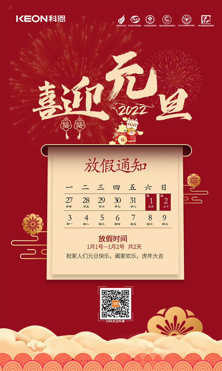 尊敬的全國科恩家人們:元旦將至,根據(jù)《國務(wù)院辦公廳公布2022年放假安排》,結(jié)合公司實際生產(chǎn)情況,科恩總部元旦放假安排通知如下: