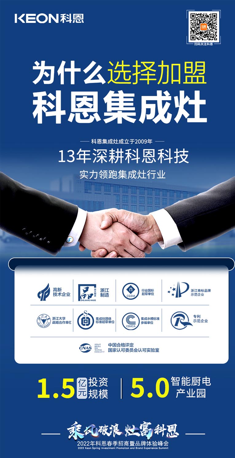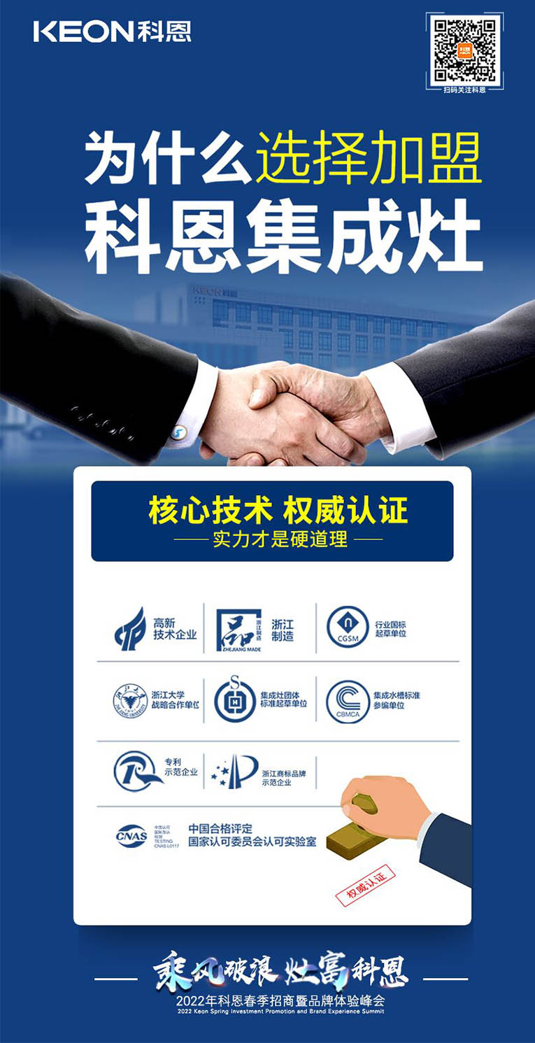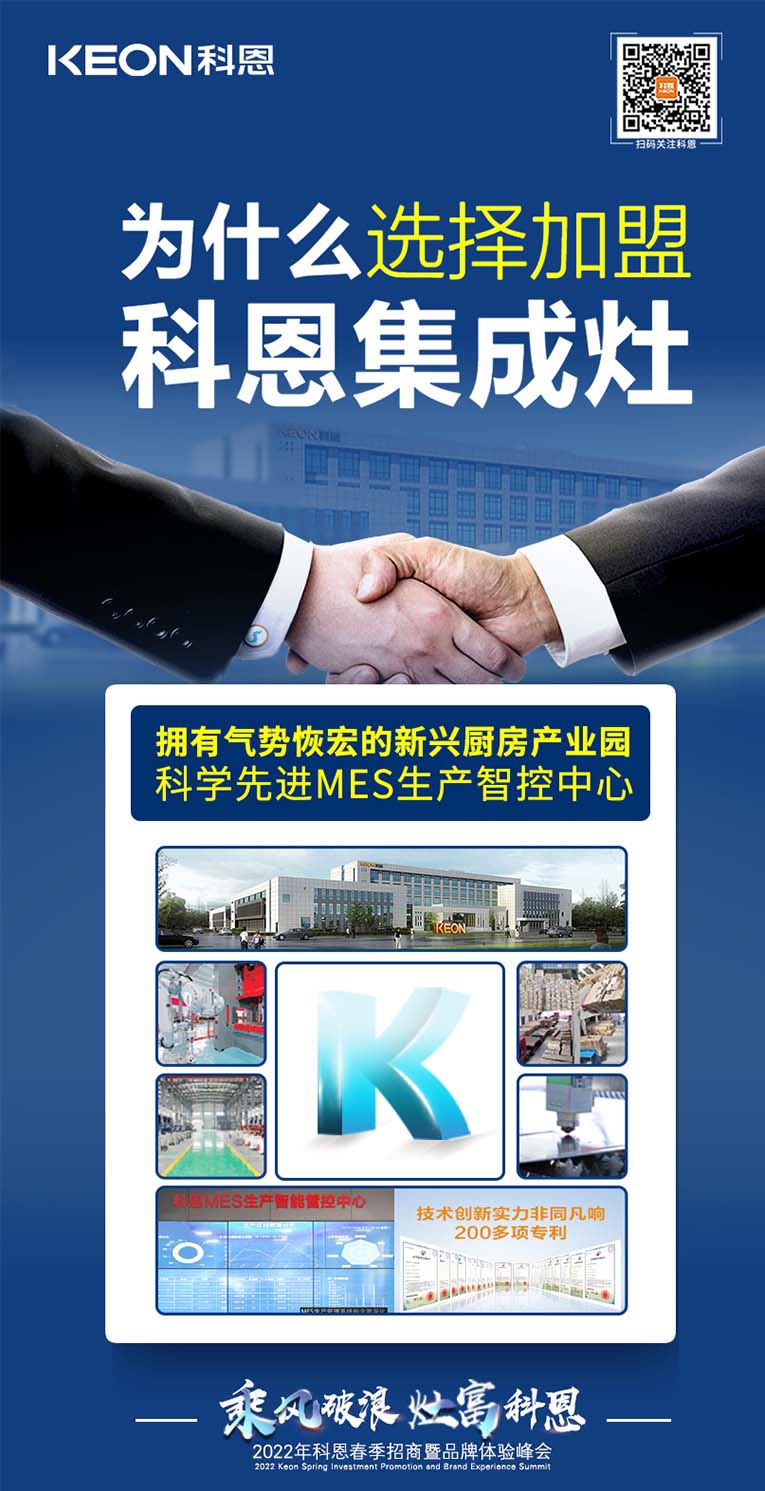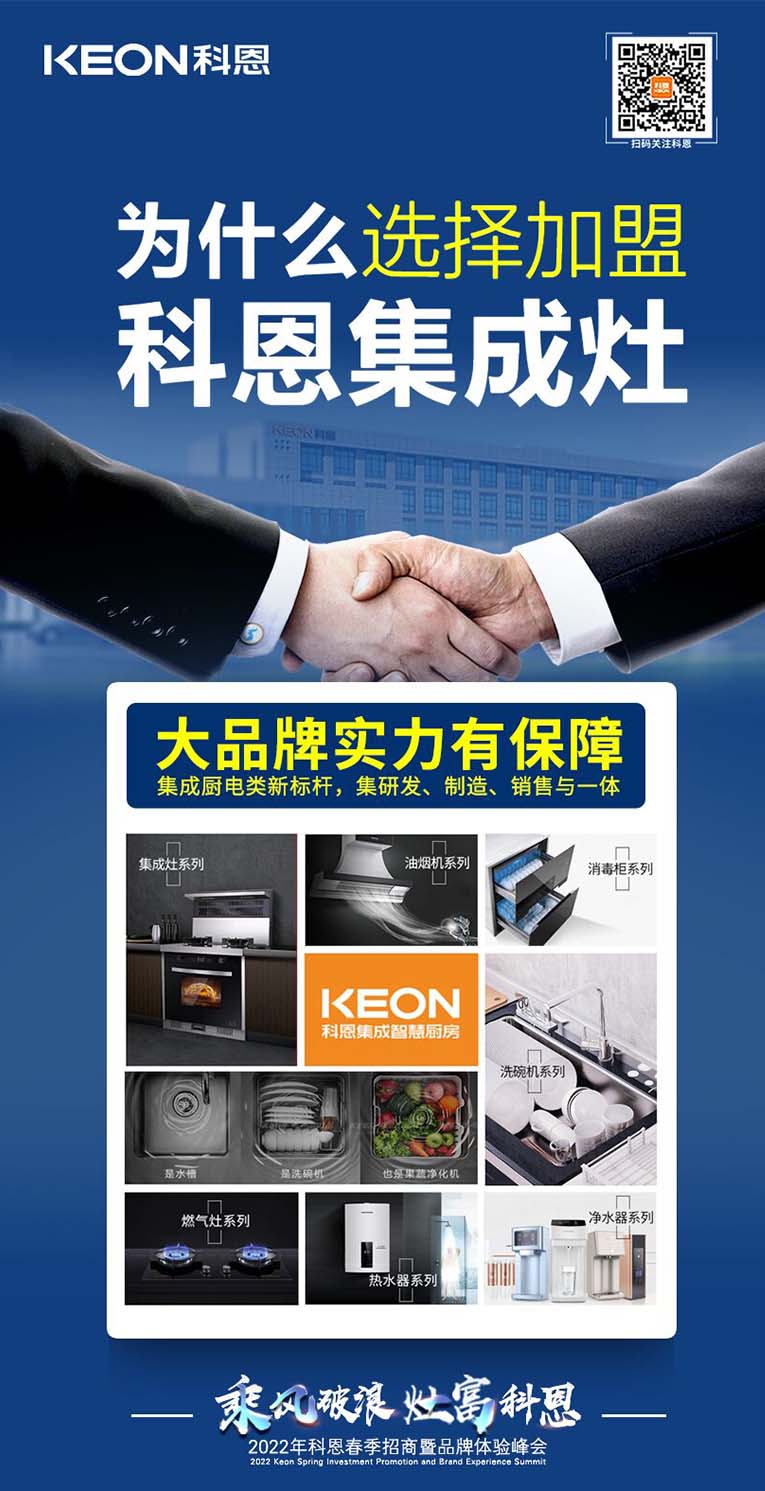 “乘風(fēng)破浪,灶富科恩”2022科恩春季招商暨品牌體驗峰會將于3月18日舉行,選擇大于努力,抓住時代機(jī)遇!集成灶十大品牌、廚電行業(yè)十大品牌科恩集成灶具備優(yōu)于業(yè)界的技術(shù)、高質(zhì)量的保證、強(qiáng)大的企業(yè)實力、有保障的售后等優(yōu)勢,實力加盟的不錯之選。