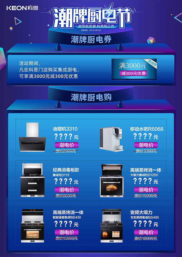 除此之外,更有科恩全國(guó)六大戰(zhàn)區(qū)同時(shí)發(fā)力,只為給全國(guó)用戶(hù)帶來(lái)瘋狂特惠!!4月1日——4月15日,進(jìn)科恩門(mén)店,潮牌廚電節(jié),更多驚喜等你揭秘~