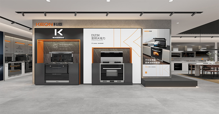 簡約、大氣、精美的視覺沖擊讓人印象深刻,通過“視覺+產(chǎn)品+體驗”的融合,以差異化彰顯品牌個性,讓消費者通過感知產(chǎn)品來感受品牌,對多個區(qū)域進行場景重構(gòu),產(chǎn)品陳列區(qū)、廚房場景、品牌背書、洽談區(qū)等,通過模塊化的方式,將核心產(chǎn)品模塊以及開放式廚房體驗場景植入門店,體現(xiàn)了更具應(yīng)用價值的“廚房新國潮,科恩新三件”!