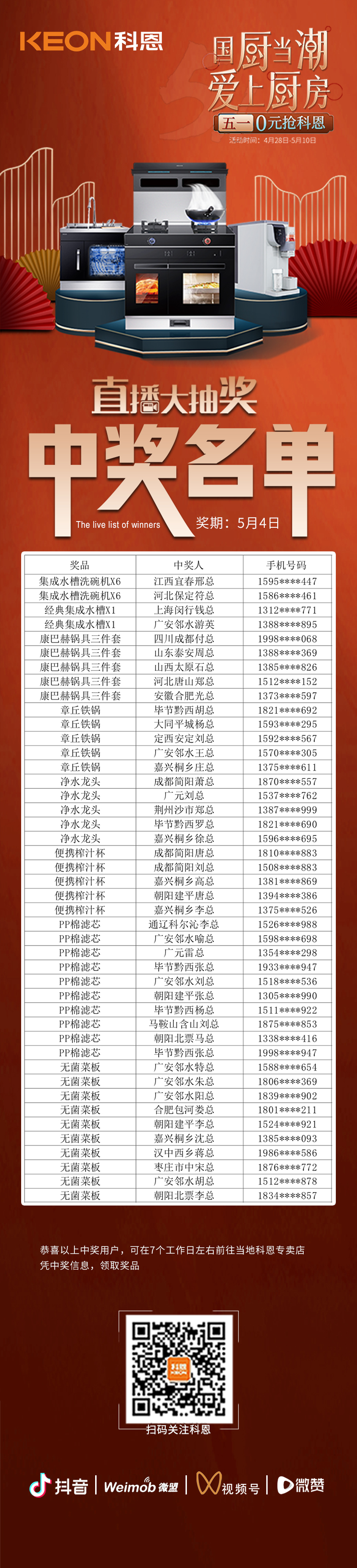 國廚當(dāng)潮,愛上廚房——0元搶科恩活動正在火爆進行中,為回饋消費者,科恩電器特于5月4日晚舉行了直播大抽獎活動。