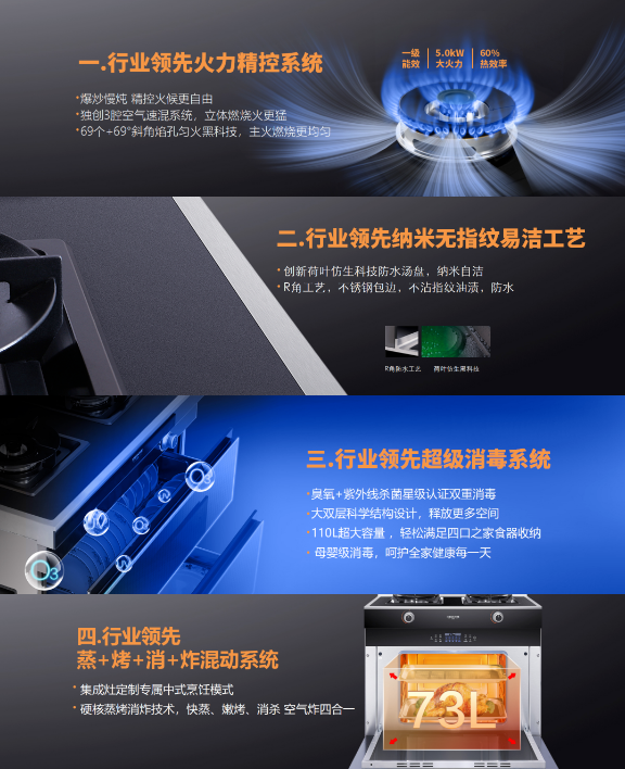 C系列集成灶配備的四項(xiàng)行業(yè)領(lǐng)先創(chuàng)新技術(shù):火力精控系統(tǒng)、納米無(wú)指紋易潔工藝、超級(jí)消毒系統(tǒng)、蒸烤消炸混動(dòng)系統(tǒng)——直擊當(dāng)下消費(fèi)痛點(diǎn),徹底解決用戶(hù)使用需求,從大火力大吸力、易清潔易打理、廣收納懂消殺、多功能全集成四個(gè)維度力破當(dāng)下行業(yè)四大頑固堵點(diǎn)。