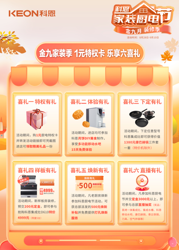 科恩電器早已提前為大家備好了金九銀十家裝好物,寶劍出鞘正待此時,【金九科恩家裝廚電節(jié)】即將火爆開啟,你要的優(yōu)惠、美食、直播、大獎,全在這里!更多驚喜,只等你來全國各大科恩專賣店一探究竟!