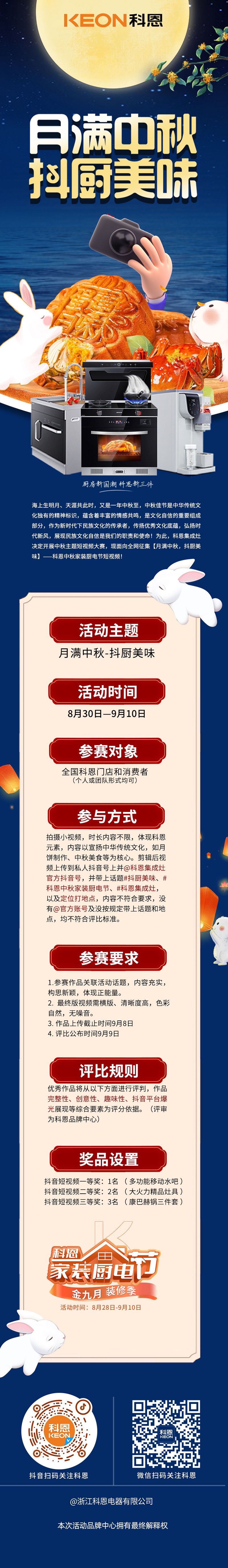 海上生明月、天涯共此時,又是一年中秋至,中秋佳節(jié)是中華傳統(tǒng)文化獨有的精神標(biāo)識,蘊(yùn)含著豐富的情感共鳴,是文化自信的重要組成部分,作為新時代下民族文化的傳承者,傳揚(yáng)優(yōu)秀文化底蘊(yùn),弘揚(yáng)時代新風(fēng),展現(xiàn)民族文化自信是我們的職責(zé)和使命!為此,科恩集成灶決定開展中秋美食節(jié)短視頻大賽,現(xiàn)面向全網(wǎng)征集【月滿中秋,抖廚美味】——科恩中秋家裝廚電節(jié)短視頻!