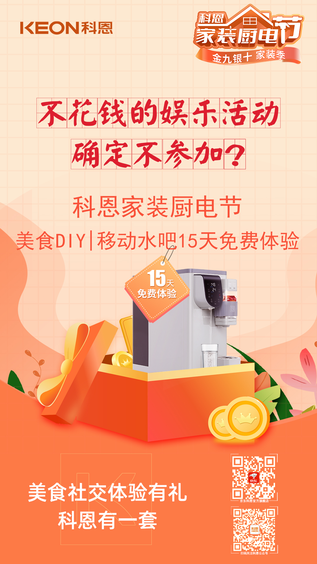 明天就是周末了,別只在家擺爛!可逛街費錢,宅家費電,有沒有什么不花錢又能carry全場的娛樂活動?來科恩家裝廚電節(jié),場地、設備、機器早已準備就緒,美食DIY,沉浸式體驗,共同制作美食,一起分享心得,還有15天免費體驗的移動水吧帶回家,美食社交,體驗有禮,確定不參加?