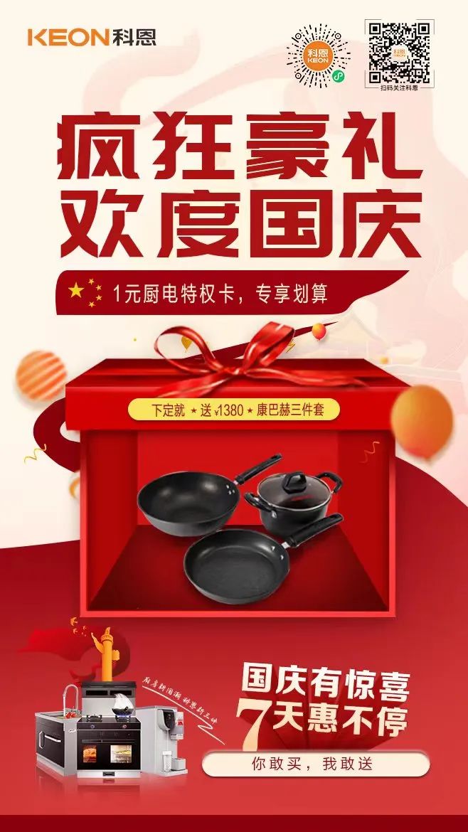 ✔ 活動(dòng)期間,下定任意型號(hào)科恩集成灶即可獲得價(jià)值1380元康巴赫鍋三件套一套!