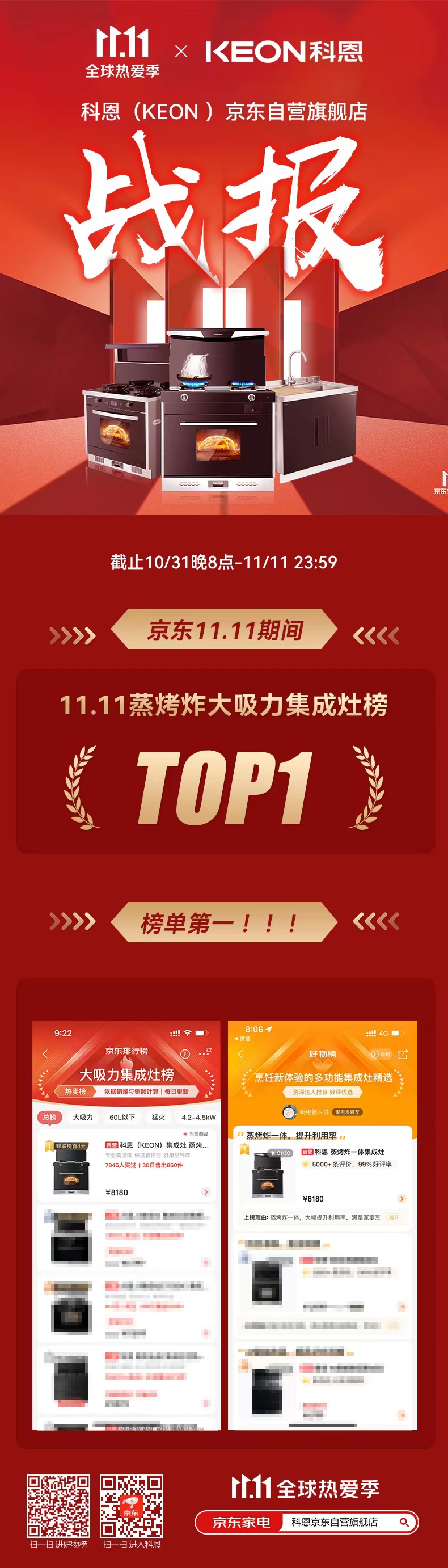 雙11全民狂歡盛宴完美落幕,科恩集成灶雙11終極戰(zhàn)報來襲,科恩集成灶火力全開,斬獲雙料第一:蒸烤炸大吸力集成灶榜TOP1,烹飪新體驗(yàn)多功能集成灶TOP1,強(qiáng)大品牌號召力毋庸置疑,科恩速度,實(shí)力盡顯!