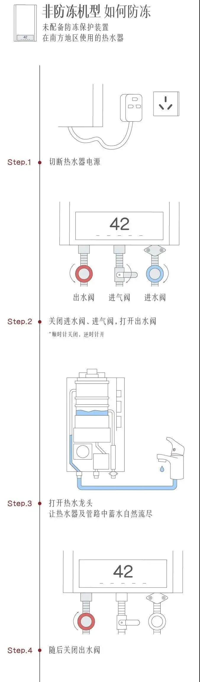 寒冬已至!當(dāng)室外溫度低于0℃時(shí),使用完熱水器后,若不及時(shí)將熱水器里的水排干凈,冷空氣變會(huì)倒灌進(jìn)熱水器內(nèi)部,水結(jié)冰后體積膨脹,容易凍壞熱水器水箱,造成不必要的麻煩和損失!因此,做好熱水器的防凍措施非常有必要!關(guān)于熱水器會(huì)被凍裂這件事,可能很多人都不會(huì)在意,為了讓大家能更好的了解熱水器如何防凍,這份防凍指南,你必須get!