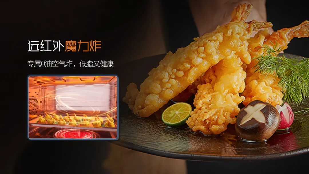 立體勻烤:頂部環(huán)形加熱管+循環(huán)風機+底部隱形加熱管,360度無死角烤制讓食材均勻受熱外酥里嫩烤的更專業(yè)。