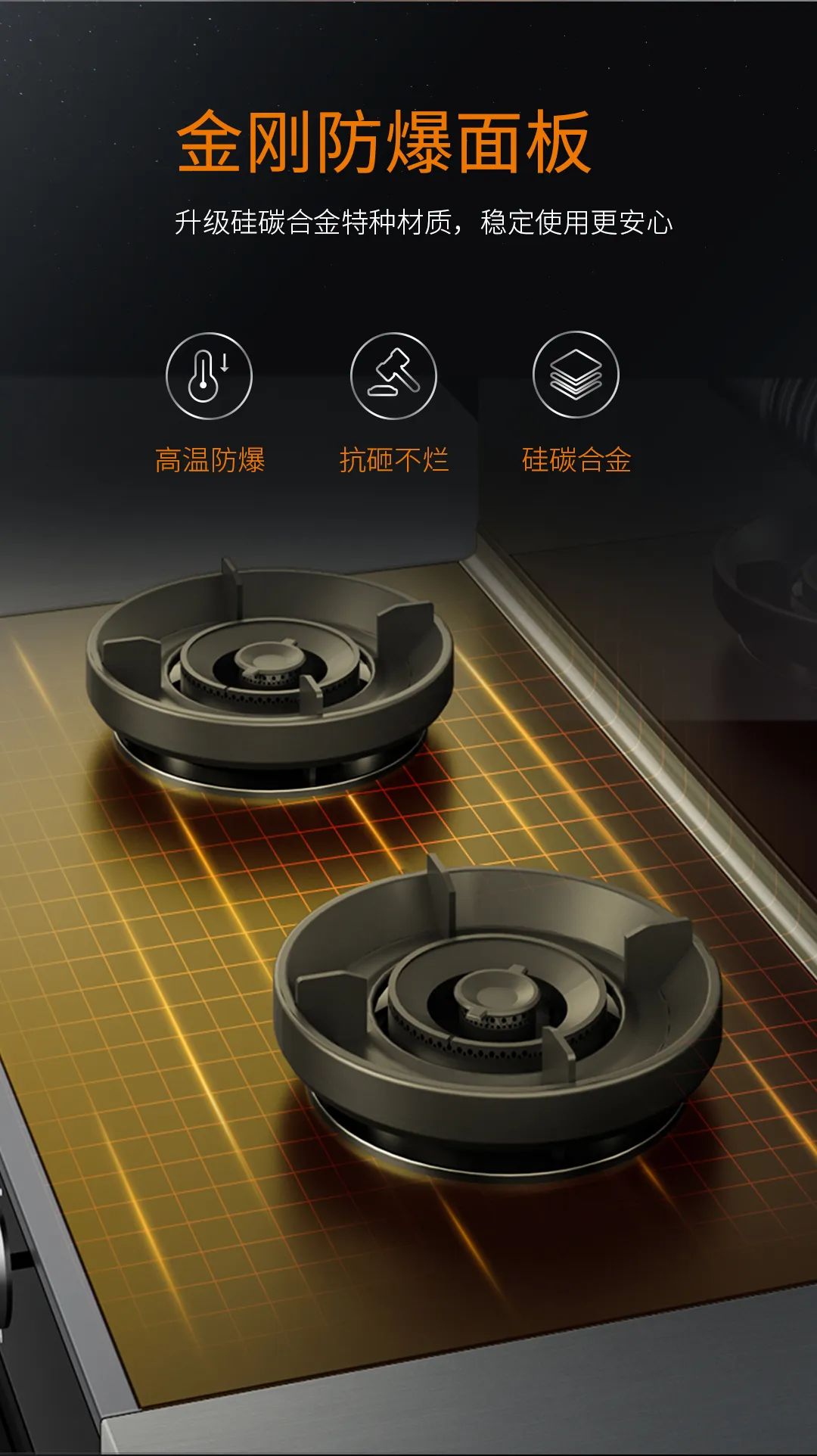 6K省心超體驗一:抗砸防爆耐高溫,安全省心!防爆免清洗集成灶采用防爆金剛板解決廚房安全隱患!硅碳合金特種材質(zhì)可耐高溫1500℃,高于國標3倍以上,更安全!