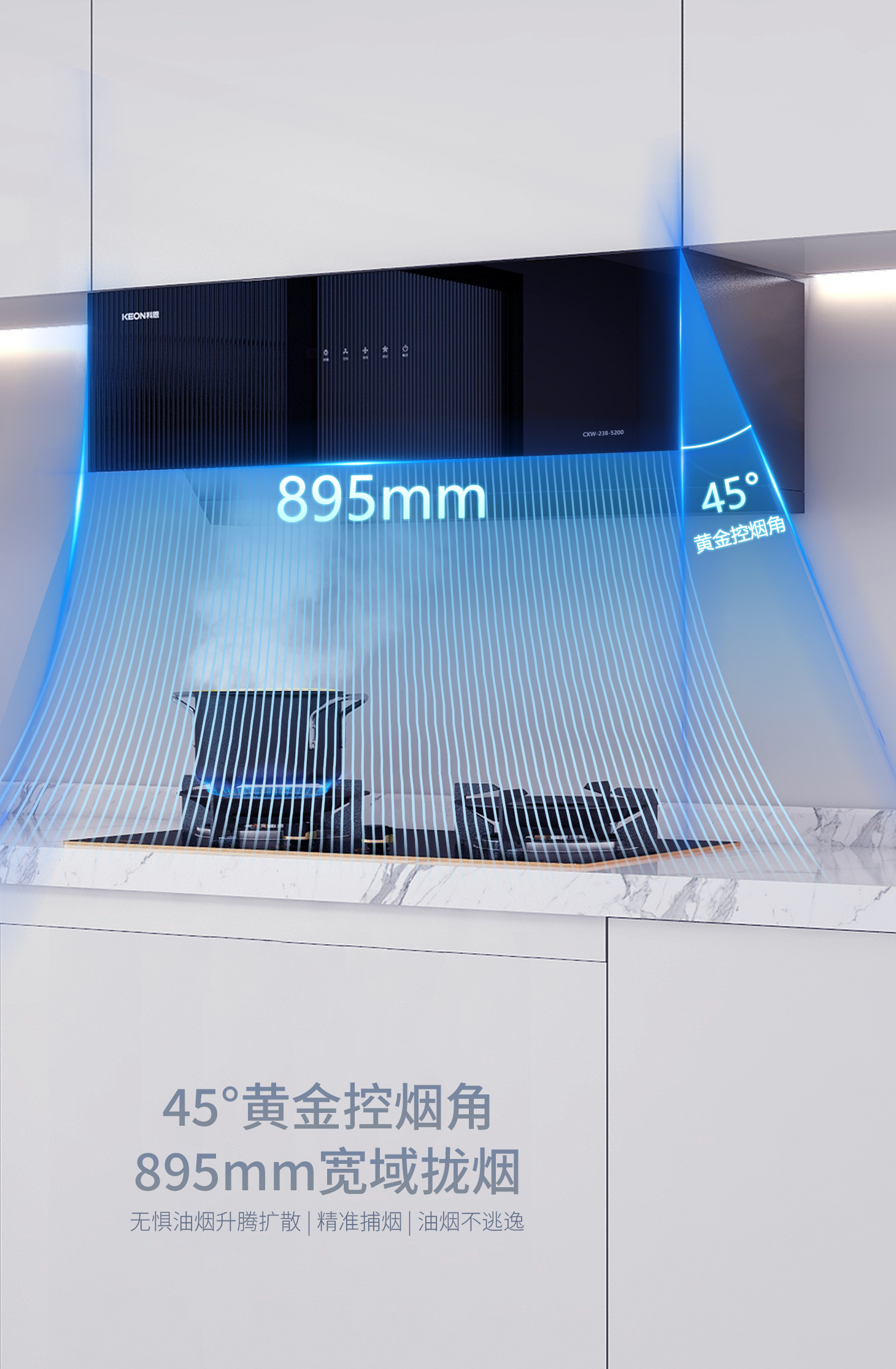 同時(shí),5200特有的45°黃金吸煙角,輕松阻絕油煙上升可能,搭配23m³/min颶風(fēng)吸力,徹底告別了油煙飄散的煩惱,輕松打造無(wú)煙廚房。