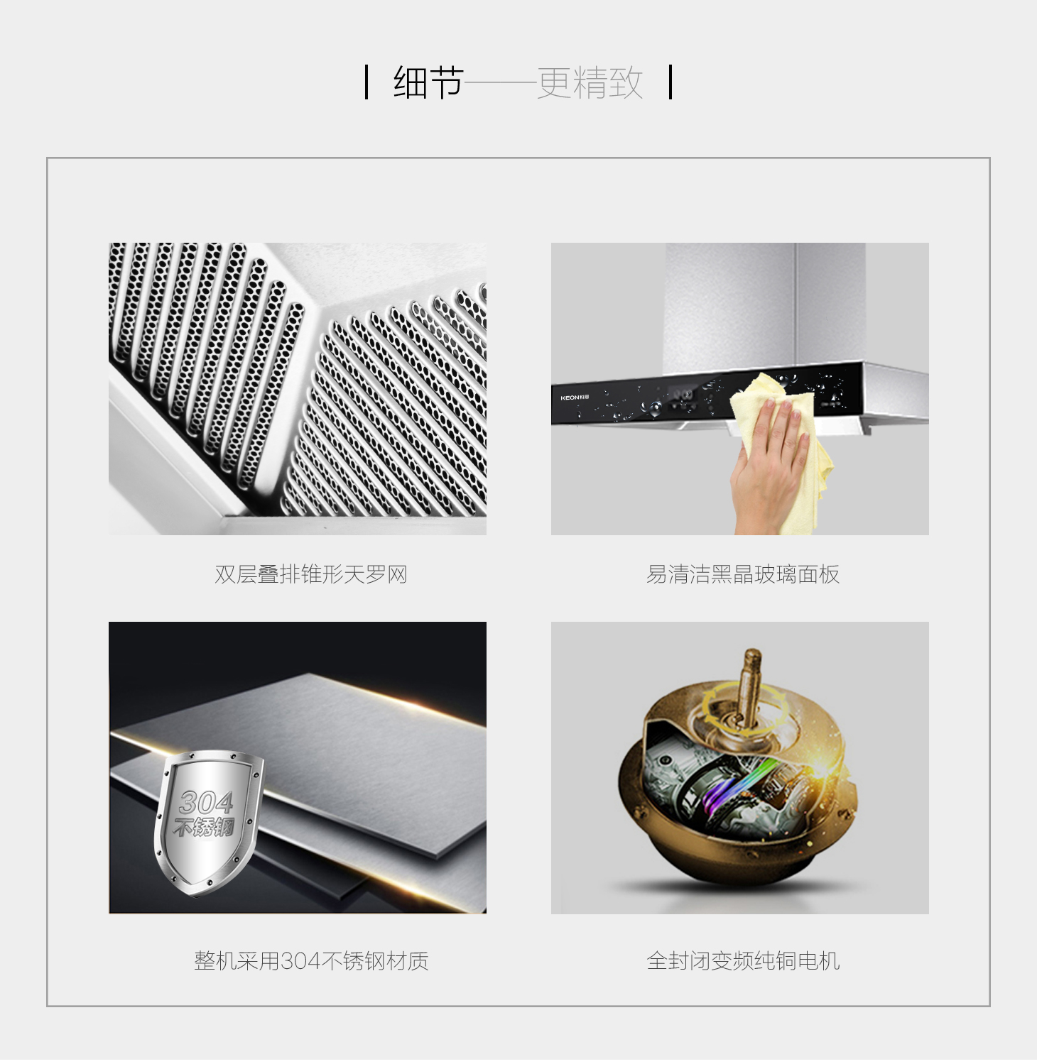 雙層疊排錐形凈濾網(wǎng),導油分離油煙更徹底。