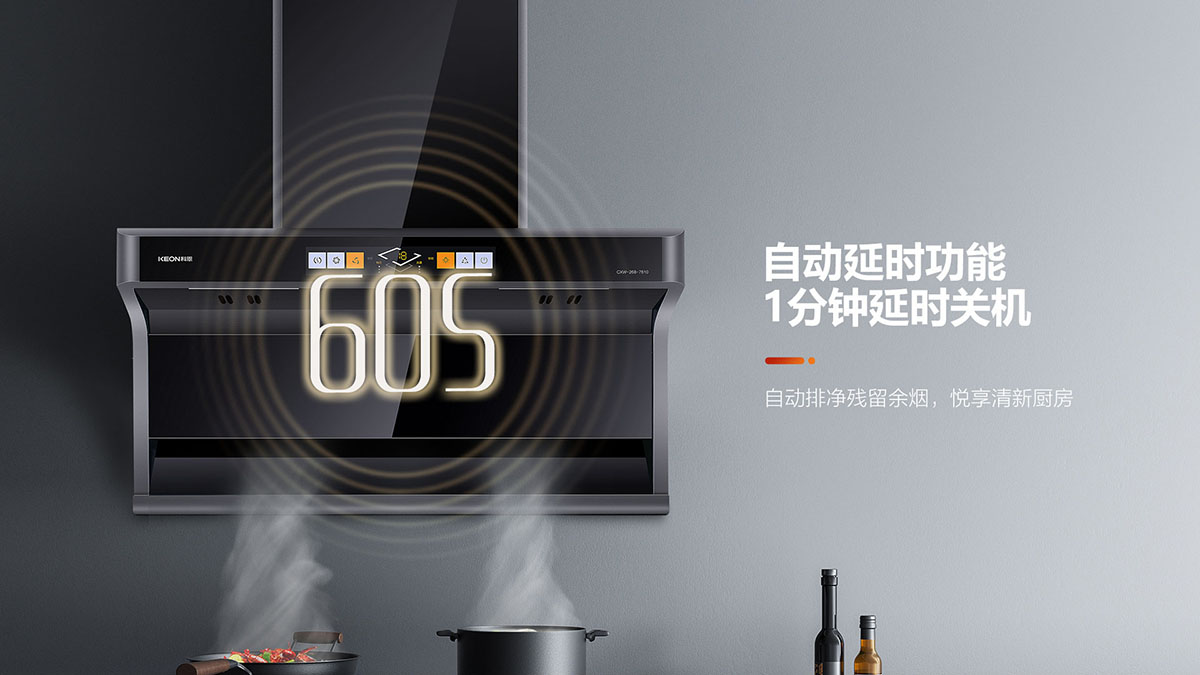 自動延時功能,1分鐘延時關(guān)機(jī),自動排凈殘留余煙,悅享清新廚房