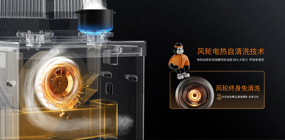 變頻電機大吸力,快勁吸煙源動力,遇強則強,無懼烹飪高峰