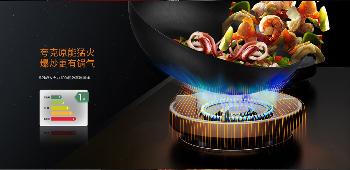一級能效,5.2kW 大火力,全進風設(shè)計,燃燒充分,爆炒給力