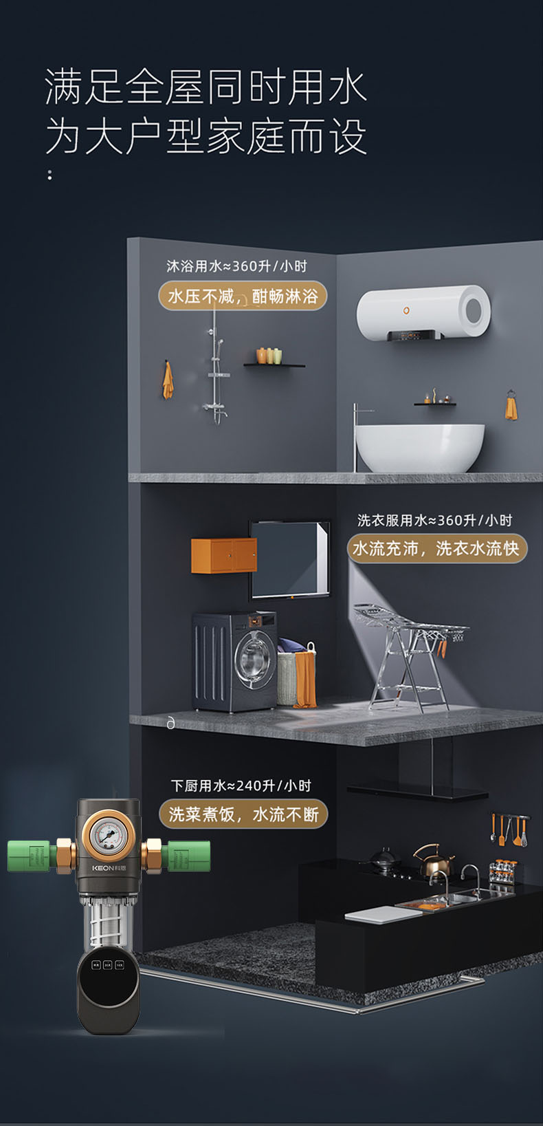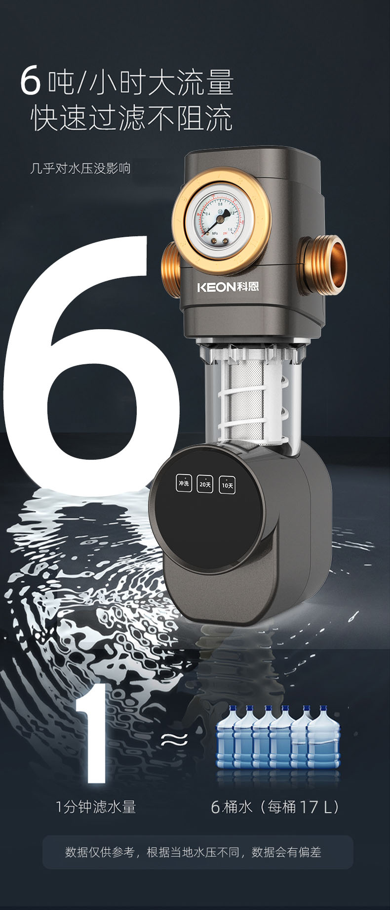 - 6噸/小時(shí)大流量,快速過濾,用水無壓力