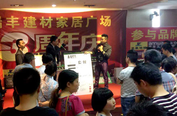 周年慶活動現(xiàn)場,大批業(yè)主聚集在瑞豐建材家居廣場,共同慶祝瑞豐建材3周年的生日。而瑞豐建材為了回饋廣大業(yè)主的厚愛,聯(lián)合全場商家為大家了準(zhǔn)備了精美的禮品與超值的優(yōu)惠。