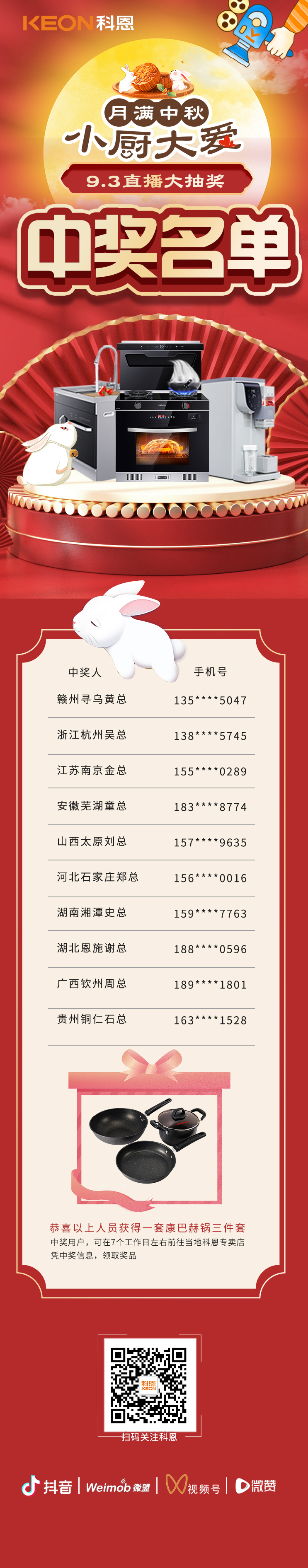 話(huà)不多說(shuō),先來(lái)公布9月3日晚第二期月餅DIY直播現(xiàn)場(chǎng)中獎(jiǎng)名單,恭喜以下10位幸運(yùn)寶寶!請(qǐng)?jiān)谄邆€(gè)工作日左右,憑中獎(jiǎng)信息到當(dāng)?shù)乜贫鲗?zhuān)賣(mài)店領(lǐng)取您的專(zhuān)屬獎(jiǎng)品!沒(méi)有中獎(jiǎng)的寶寶也不用氣餒,沒(méi)準(zhǔn)下一期的直播大獎(jiǎng)就在向你招手!你就是幸運(yùn)錦鯉本鯉!