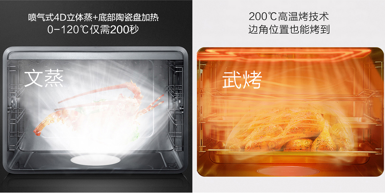62L大容量食品級304不銹鋼內(nèi)膽,上下4層設(shè)計,9種蒸烤模式。