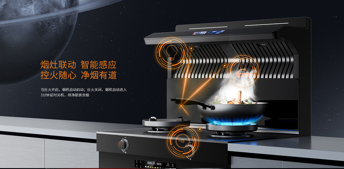 煙灶聯(lián)動,點火煙機及照明燈自動開啟;三分鐘延時,自動掃除殘留煙油