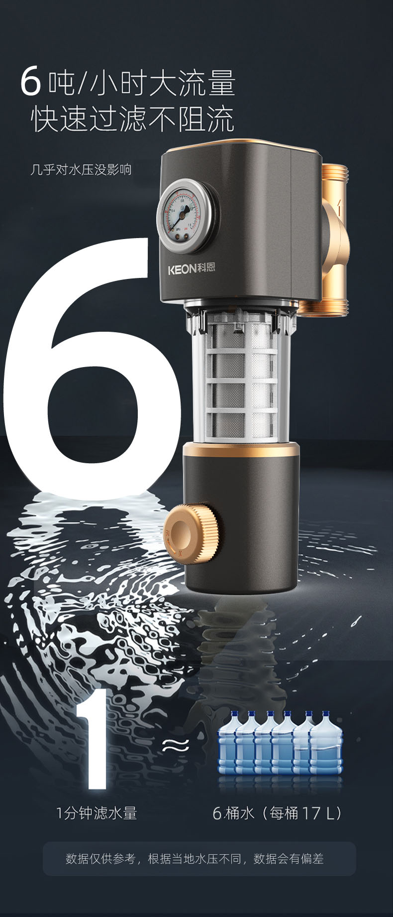 6噸/小時(shí)大流量,快速過濾,全屋用水無壓力